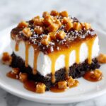 Let the cake cool completely to room temperature. This patience pays off because it gives the structures inside the cake time to set and hold all the delicious filling. Once cooled, gently spread the whipped topping across the surface, creating a cloud-like layer that contrasts perfectly with the dense chocolate cake and gooey caramel.