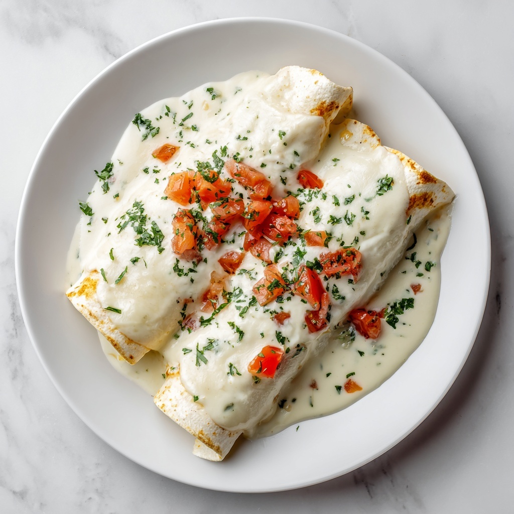 Delicious and creamy Chicken Enchiladas with a tangy sour cream white sauce, featuring tender shredded chicken wrapped in warm flour tortillas, topped with a blend of Monterey Jack and cheddar cheese, then baked to perfection. This comforting Tex-Mex dish offers a rich and flavorful twist on traditional enchiladas, perfect for a family dinner.