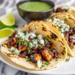 The magic of these grilled chicken tacos is brought to life by simple garnishes. Chopped fresh cilantro adds an herbaceous freshness, diced white onion brings a crunchy bite, and bright lime wedges provide acidity that cuts through the smoky richness of the chicken. These classic toppings turn each taco into a vibrant, well-rounded experience.