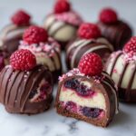 These Chocolate Raspberry Mousse Bites are decadent, bite-sized treats featuring a smooth chocolate mousse center with a surprise raspberry jam filling, all coated in rich melted chocolate. Perfect as elegant party snacks or a delightful dessert, they combine creamy texture with a burst of fruity sweetness, decorated with edible glitter or rose petals for a stunning presentation.