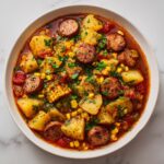 Now, pour in the petite diced tomatoes (with their liquid), baked beans or ranch beans, chopped green chilies, sweet corn (including their liquid), cubed potatoes, along with the cooked bacon and kielbasa. Add the cup of water to give everything a proper simmering base. Stir well to combine all those bold flavors.