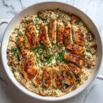 This Creamy Mushroom Chicken and Rice recipe combines tender seared chicken breasts with a savory mushroom and garlic sauté, all cooked together with long-grain rice in a rich, creamy Parmesan sauce. Perfect for a comforting and satisfying weeknight dinner, this one-pan meal is packed with flavor and ready in just 45 minutes.