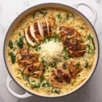 This Creamy Parmesan Orzo with Chicken and Asparagus is a comforting and flavorful one-pan meal perfect for busy weeknights. Tender chicken breasts are seasoned and seared to golden perfection, paired with sautéed asparagus and a luscious, cheesy orzo cooked in a creamy blend of half and half and chicken broth. The dish is finished with freshly grated Parmesan cheese and bright parsley, creating a rich yet balanced meal that’s both easy to prepare and satisfying.