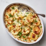 Dad’s Creamy & Cheesy Au Gratin Potatoes is a comforting and rich side dish featuring thinly sliced Yukon gold potatoes layered with onions and smothered in a velvety cheese sauce made from sharp cheddar, Gruyere, and Parmesan. Baked to golden perfection, this casserole is perfect for family dinners and special occasions.