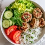 These Greek Chicken Meatballs are flavorful and tender, infused with herbs like dill and mint, and seasoned with a blend of spices. Pan-fried to a perfect golden brown, they’re served over fresh romaine with traditional Greek accompaniments like feta cheese, cucumber, tomato, rice, and tzatziki sauce, making for a delicious and wholesome Mediterranean-inspired meal.