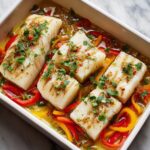 Start by preheating your oven to 400°F (200°C), setting the stage for perfectly baked fish and roasted peppers. While it heats up, lightly grease a baking dish or line it with parchment paper to prevent sticking and make cleanup a breeze. In a large bowl, toss the vibrant sliced bell peppers with olive oil, minced garlic, dried thyme, basil, oregano, and a pinch of salt and pepper. This simple mix ensures the peppers will soften beautifully and soak up those incredible herb flavors as they bake.