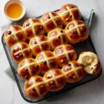 A classic traditional Hot Cross Buns recipe featuring soft, spiced buns studded with sultanas and candied peel, topped with signature flour crosses and a glossy apricot jam glaze. Perfect for Easter or any cozy teatime indulgence.