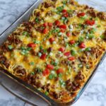 This Taco Spaghetti Casserole is a delightful fusion dish combining the comforting texture of spaghetti with bold Mexican flavors. Featuring tender cooked chicken, creamy soup, salsa, and a taco seasoning blend, this casserole is topped with melted Mexican blend cheese and fresh cilantro for a crowd-pleasing meal that’s easy to prepare and perfect for family dinners.