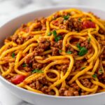 A flavorful and easy one-pan Taco Spaghetti recipe that combines ground beef, taco seasoning, tomatoes, and spaghetti noodles for a delicious Tex-Mex twist on classic pasta. Ready in just 30 minutes and perfect for a quick family dinner.