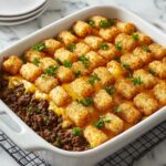 This classic Tater Tot Casserole is a comforting and easy-to-make dish featuring seasoned ground beef, creamy mushroom soup, crispy tater tots, and melted cheddar cheese, baked to perfection. Perfect for a family dinner, this hearty casserole combines simple ingredients into a satisfying meal in just 45 minutes.